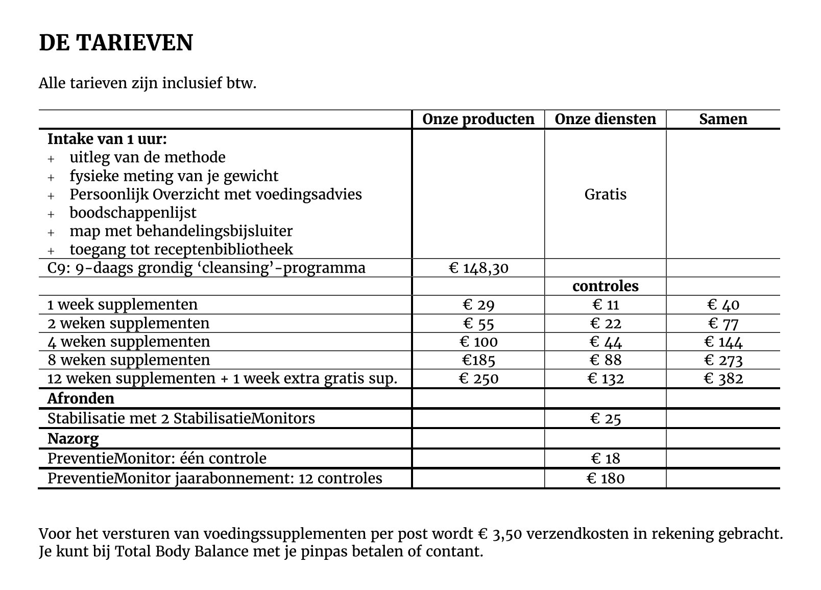 Vakantie, kerstdagen of (zaken)dineetjes: soms is het lastig om verantwoord te blijven eten zonder aan te komen. Daarom biedt Total Body Balance je de PreventieMonitor aan en indien nodig kan je op tijd corrigeren met bijvoorbeeld een correctiepakket of C9. Zo voorkom je dat je opnieuw langdurig moet afslanken.Het Correctiepakket is er als je eerder een afvaltraject bij Total Body Balance hebt gevolgd. Het helpt je om niet weer langdurig te moeten afvallen. Je krijgt een voedingsadvies, voedingssupplementen en toegang tot de receptenbibliotheek met ruim zeshonderd recepten. Je haalt het op bij Total Body Balance of je bestelt het via de webshop.